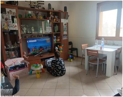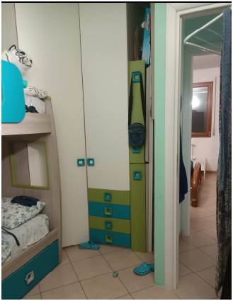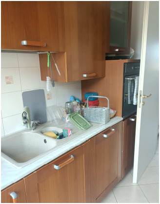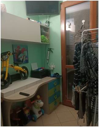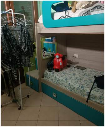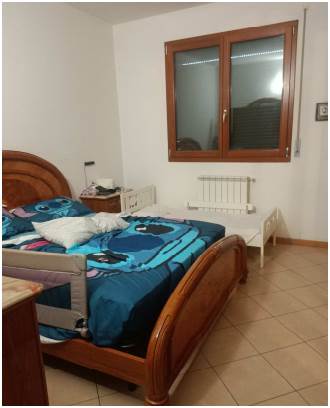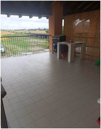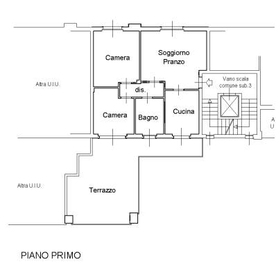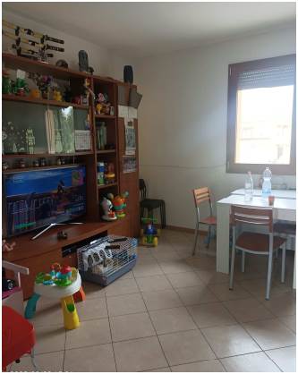 Abitazione posta al primo piano composta da ingresso aperto sul soggiorno, cucina, corridoio di disimpegno, n. 2 camere da letto e bagno. Con accesso dalla cucina e dalla cameretta si accede al balcone ed all’ampia terrazza